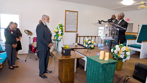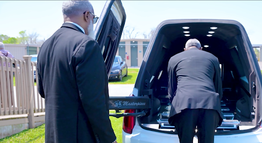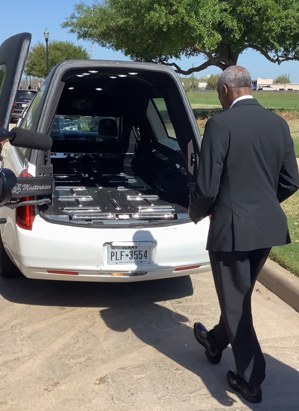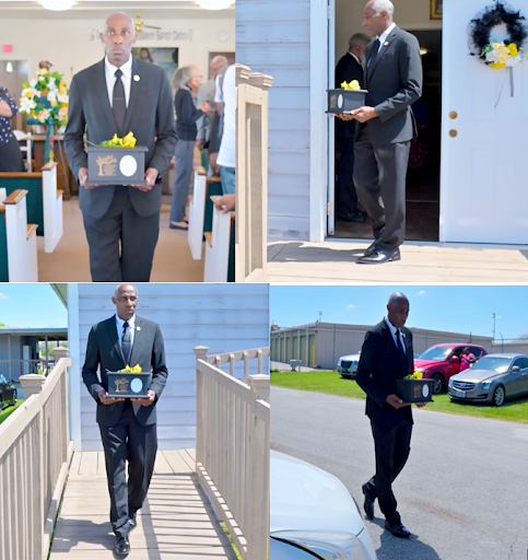 At the end of the funeral service, a Rodney F. Byrd Funeral Director respectfully transferred the urn from the church to the hearse.